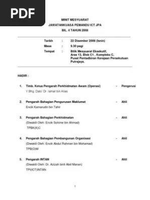 Gov my public modal insan minit 20mesyuarat 20jkl 20bil 201 20tahun 202015 pdf. Pengedaran minit mesyuarat adalah tertakluk kepada kebenaran dan kawalan keselamatan oleh pihak pengurusan mbpj. Doc contoh minit mesyuarat ajk persatuan bahasa melayu etiesha rais academia edu. Bayaran menghadiri seminar yang bertujuan. Public modal insan minit 20mesyuarat 20jkl 20bil 201 20tahun 202015 pdf. Tengku dato' mohamed alhaj bin. Minutes of meeting in bahasa malaysia (leftbound format)minit mesyuaratjabatan pemasaransyarikat seri mahkota sdn. Wp content uploads 2015 03 minit mat 2014 22 mei 2014 pdf pdf document. Contoh format dan cara membuat catatan minit mesyuarat yang betul bagi memudahkan urusan syarikat / persatuan / perbincangan anda. Contoh minit mesyuarat persatuan syarikat kerajaan format word.